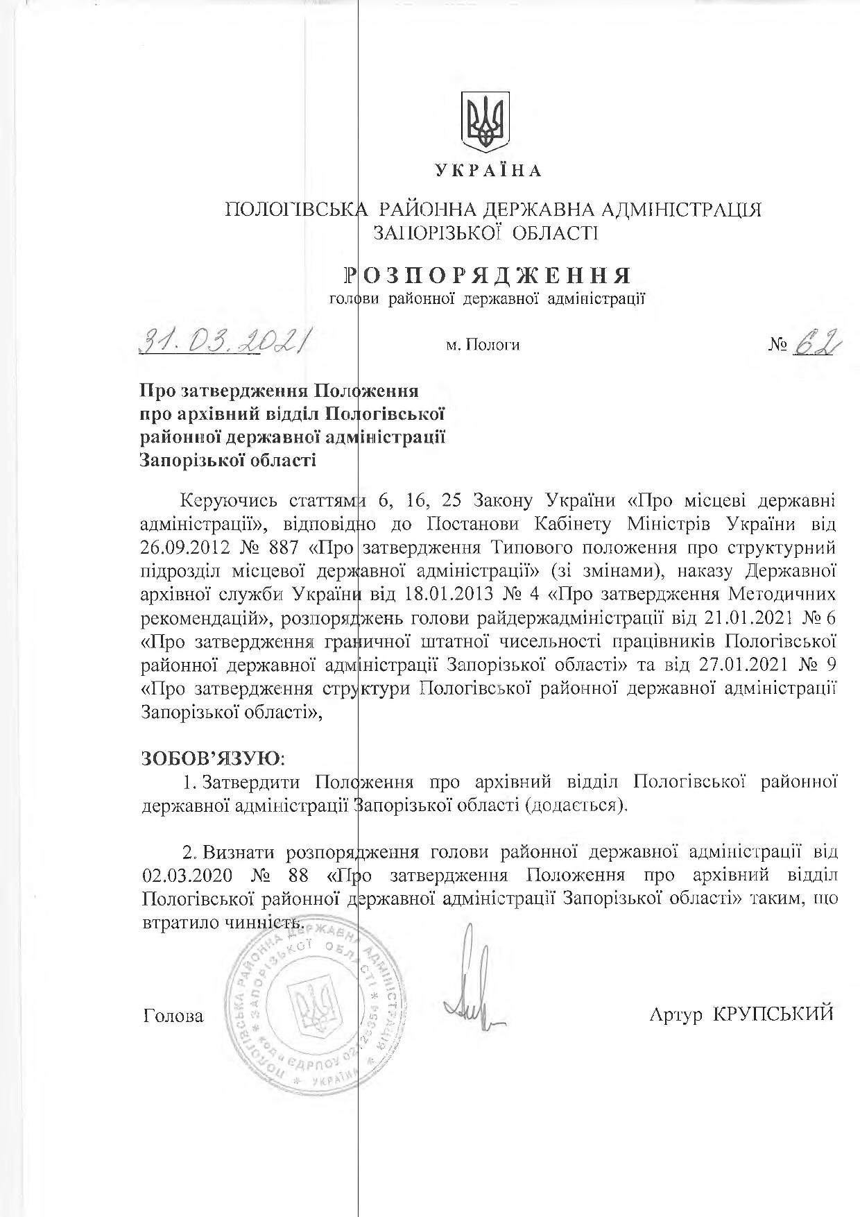 Положення про архівний відділ Пологівської районної державної адміністрації Запорізької області
