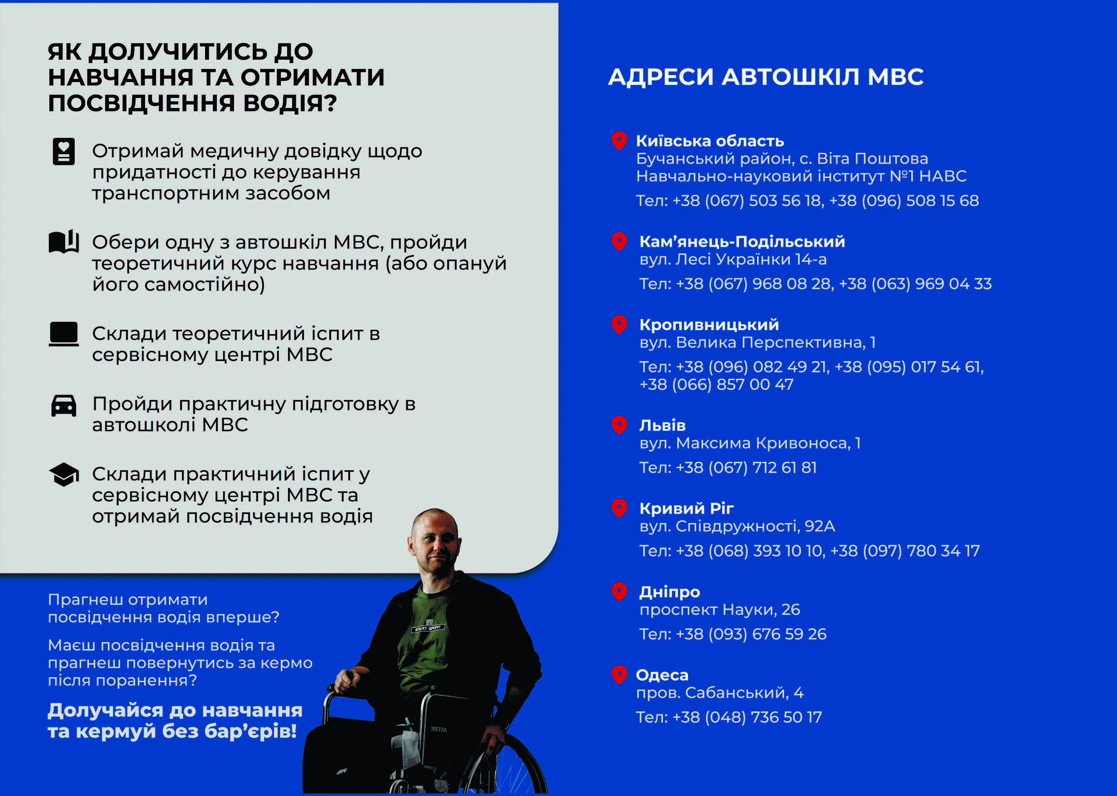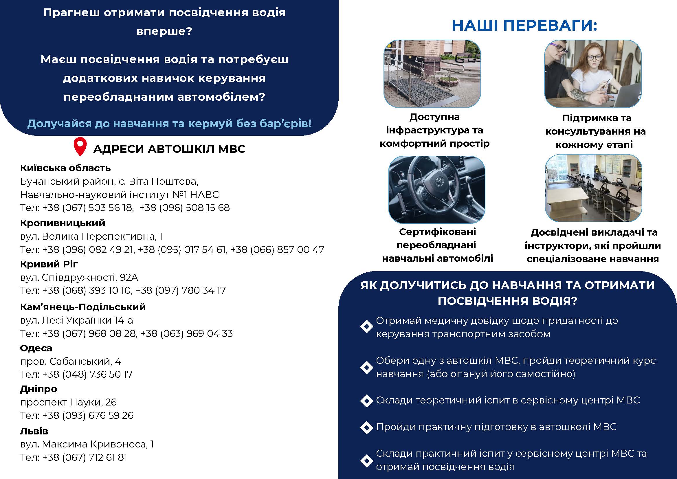 Нині серед громадян України користується попитом послуга з отримання посвідчення водія. Серед охочих кермувати автівкою є й люди з інвалідністю. Саме тому в Україні було створено автошколи для осіб з інвалідністю. «Автошколи для осіб з інвалідністю» – це флагманський проєкт Міністерства внутрішніх справ України, який реалізується у рамках ініціативи «Без бар’єрів» Першої леді України Олени ЗЕЛЕНСЬКОЇ.