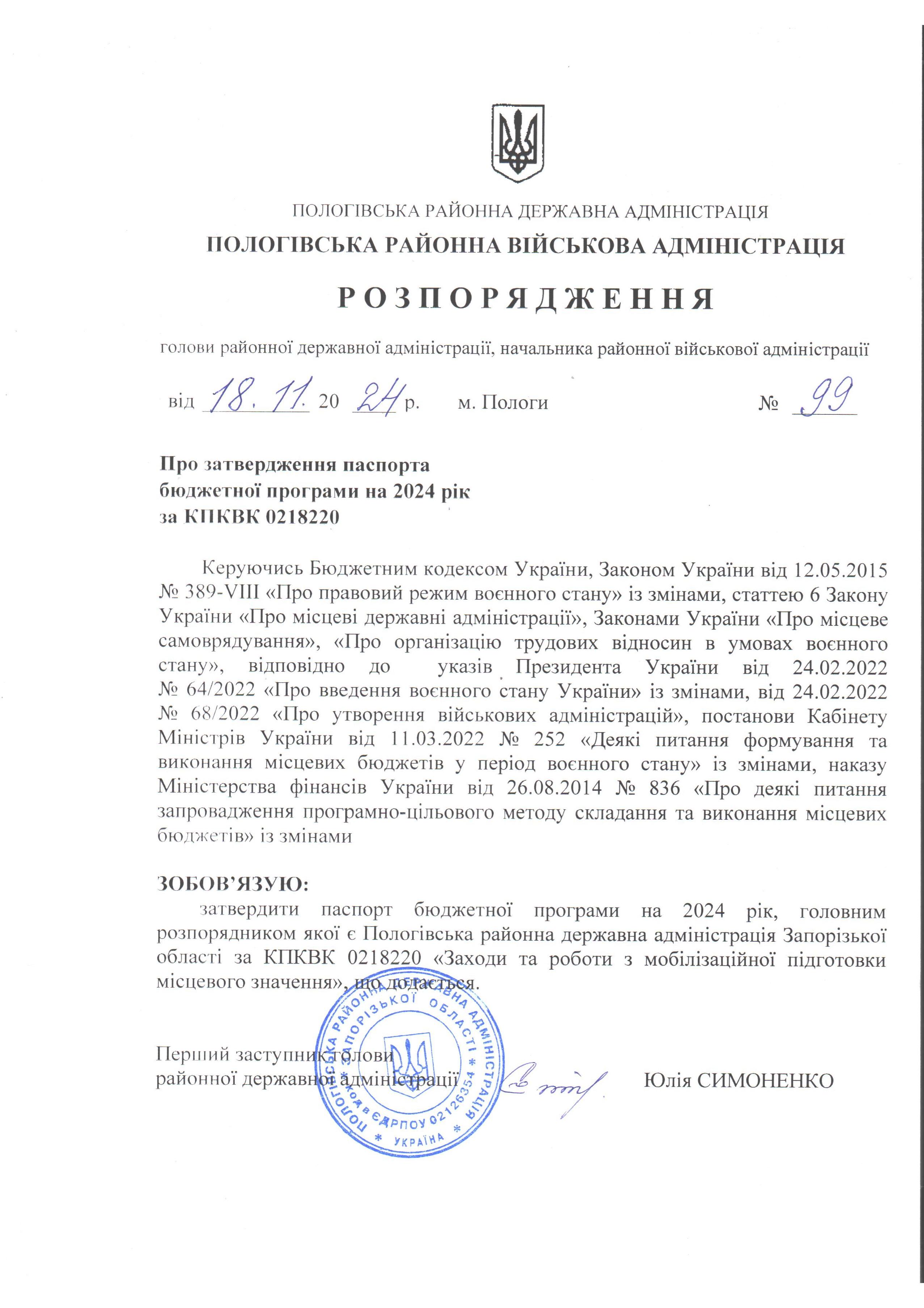 Розпорядження N99 від 18.11.2024 року "Прозатвердження паспорту бюджетної программи на 2024 рік за КПКВК 0218220"
