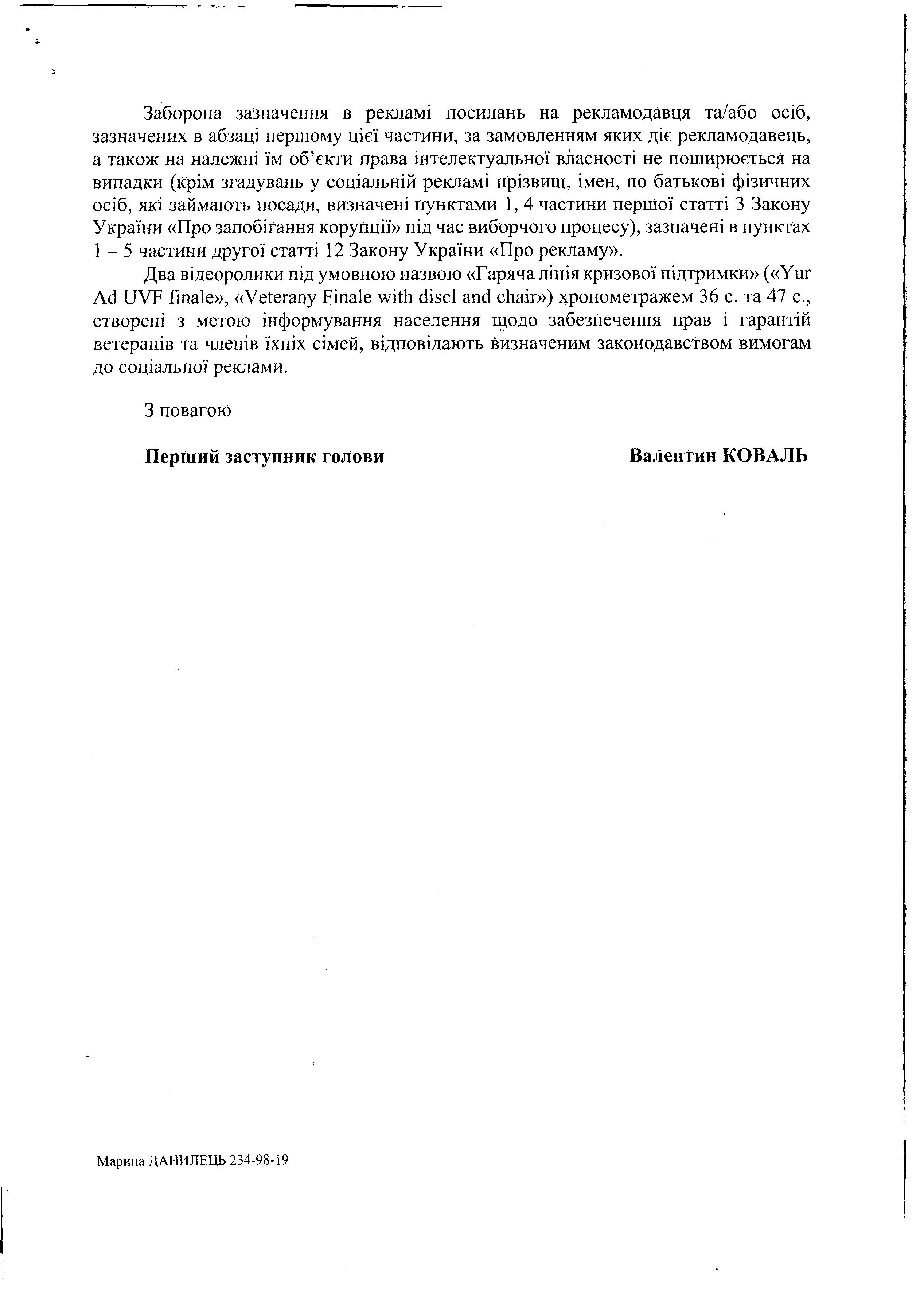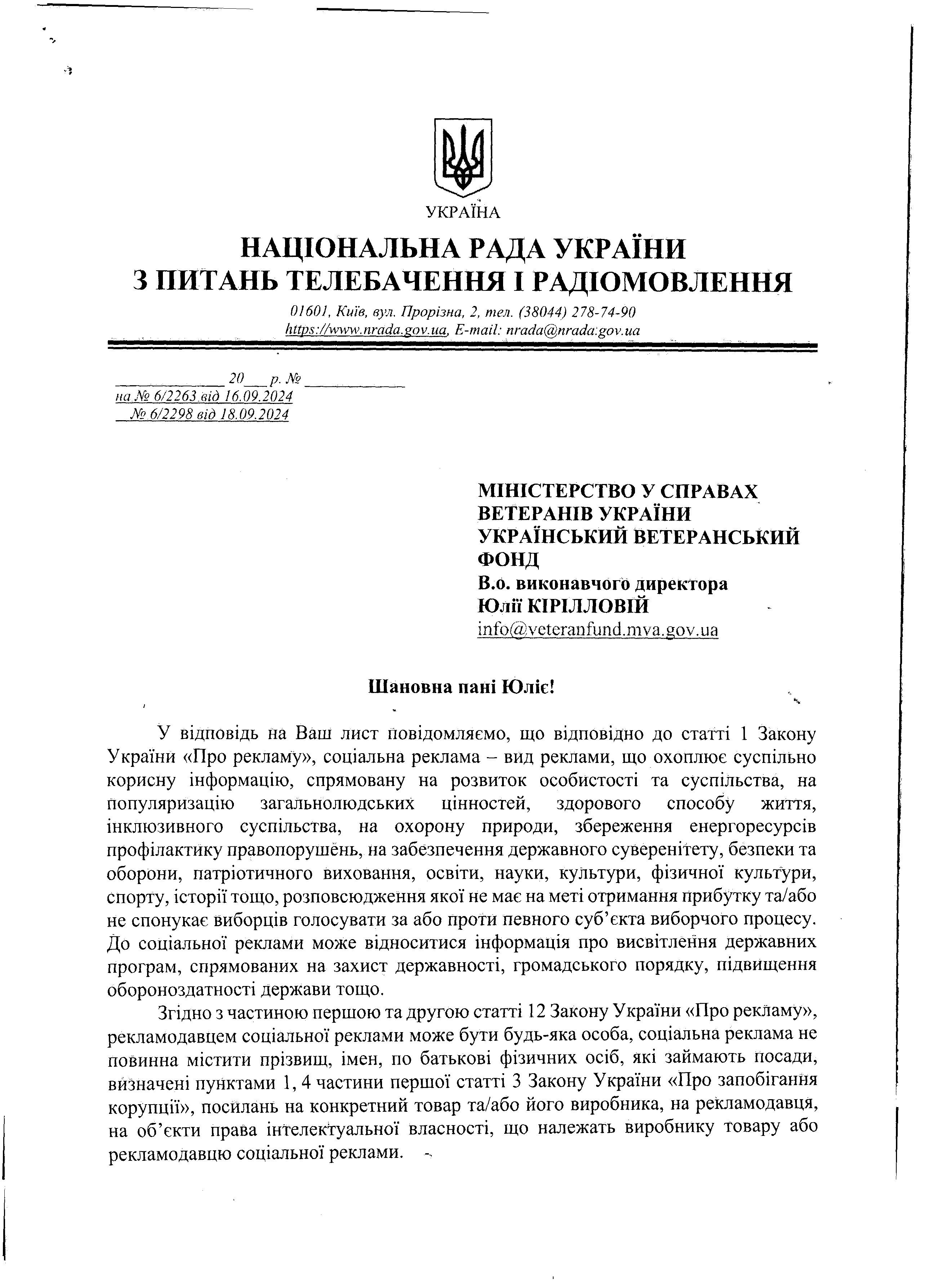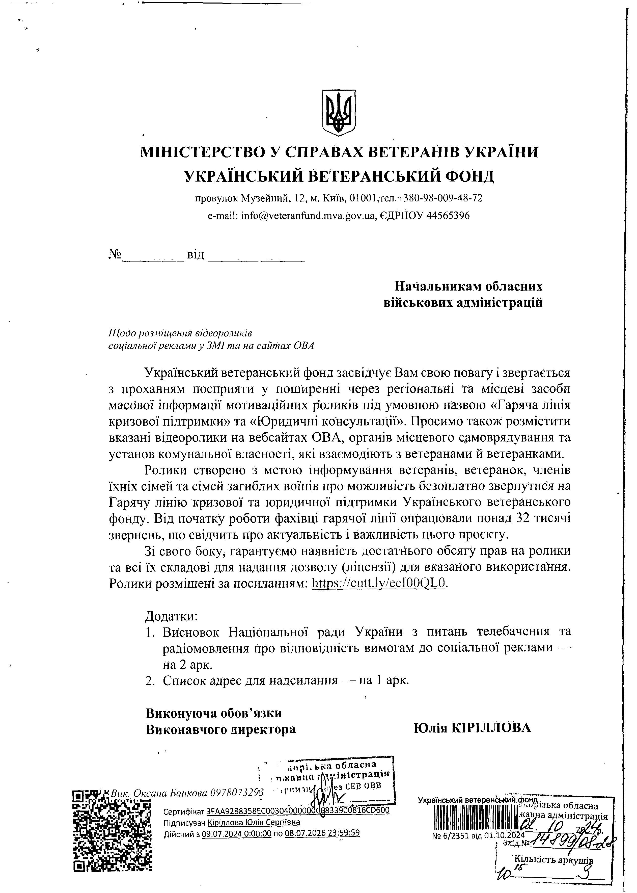 УКРАЇНСЬКИЙ ВЕТЕРАНСЬКИЙ ФОНД Про розміщення відеороликів соціальної реклами для ветеранів "Гаряча лінія кризової підтримки" та "Юридичні консультації"