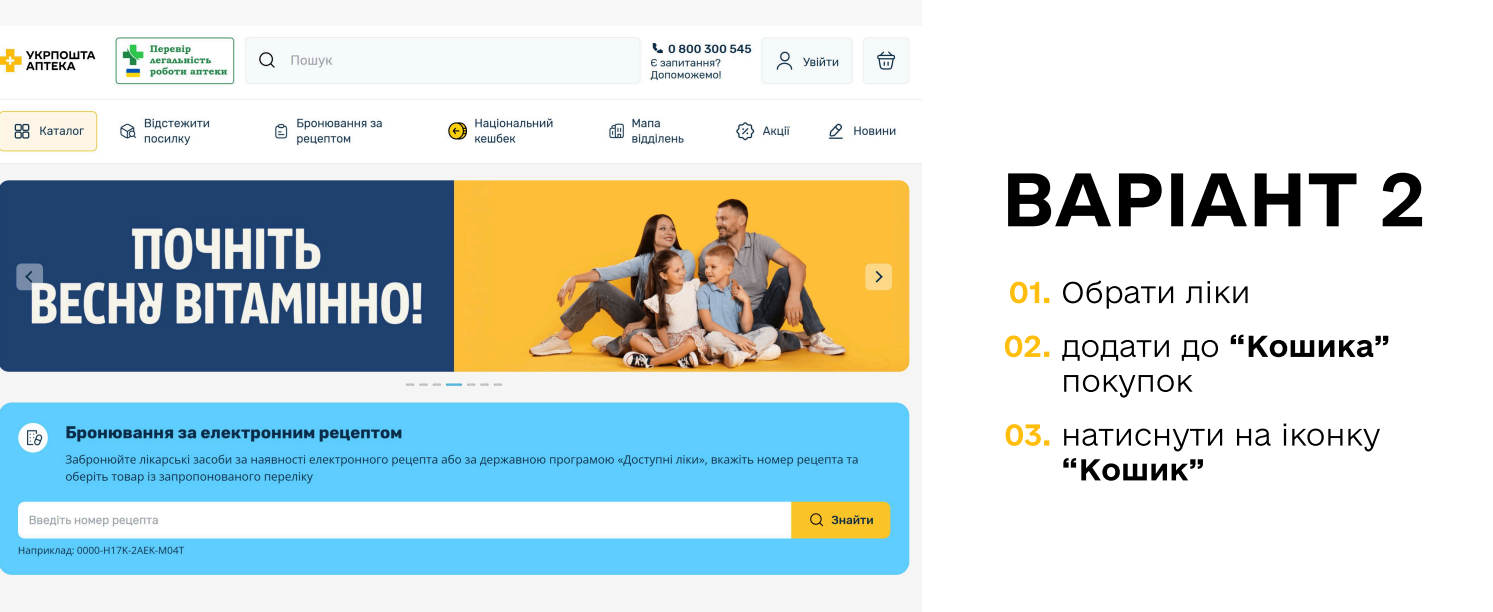 - обрати потрібні препарати (наразі доступні безрецептурні та ті, що входять до програми «Доступні ліки»)