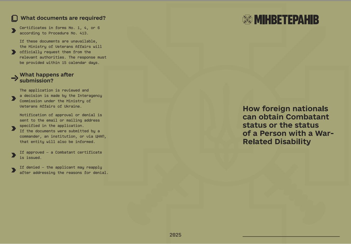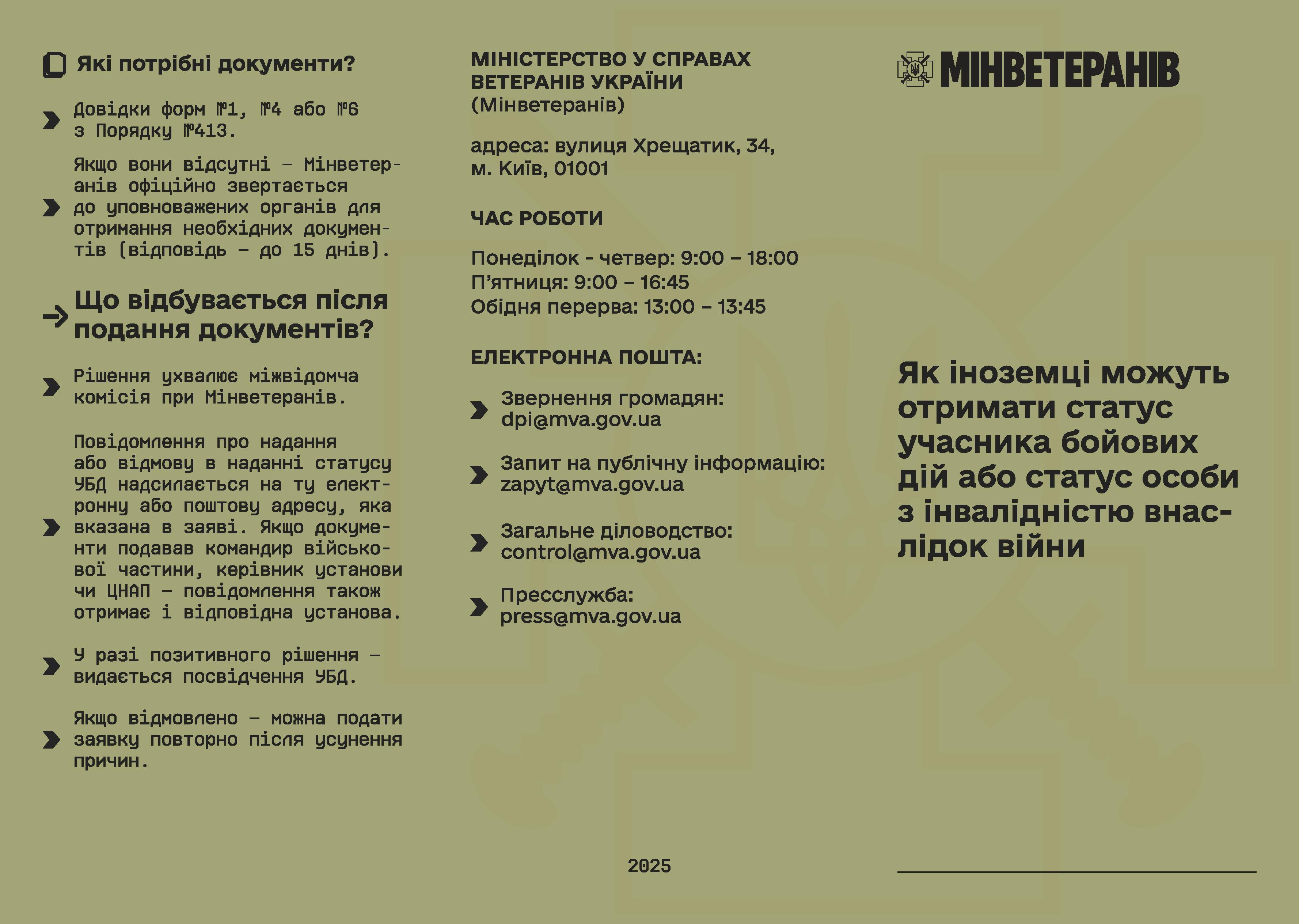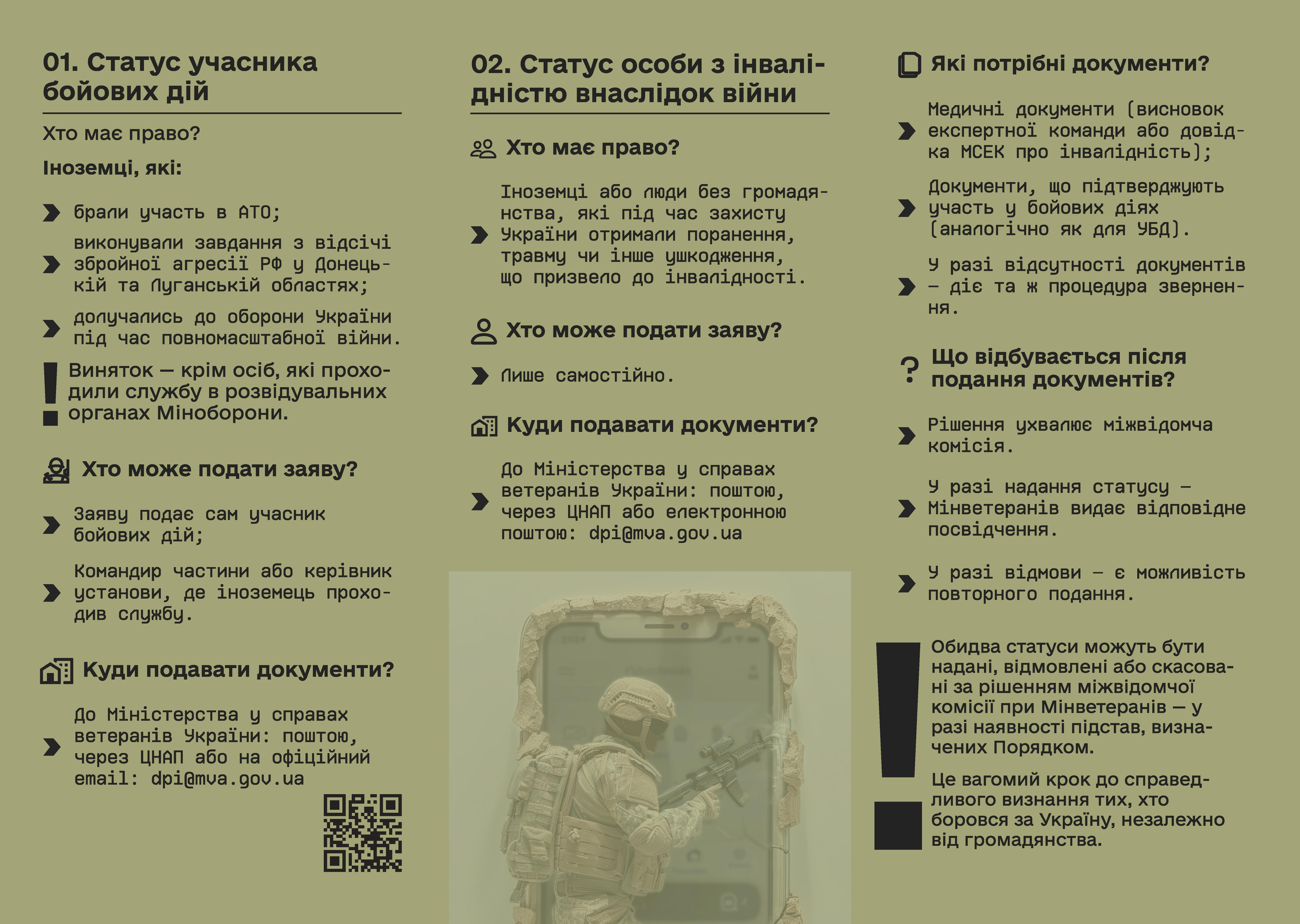 Отримання іноземцями статусу учасника бойових дій або особи з інвалідністю внаслідок війни.