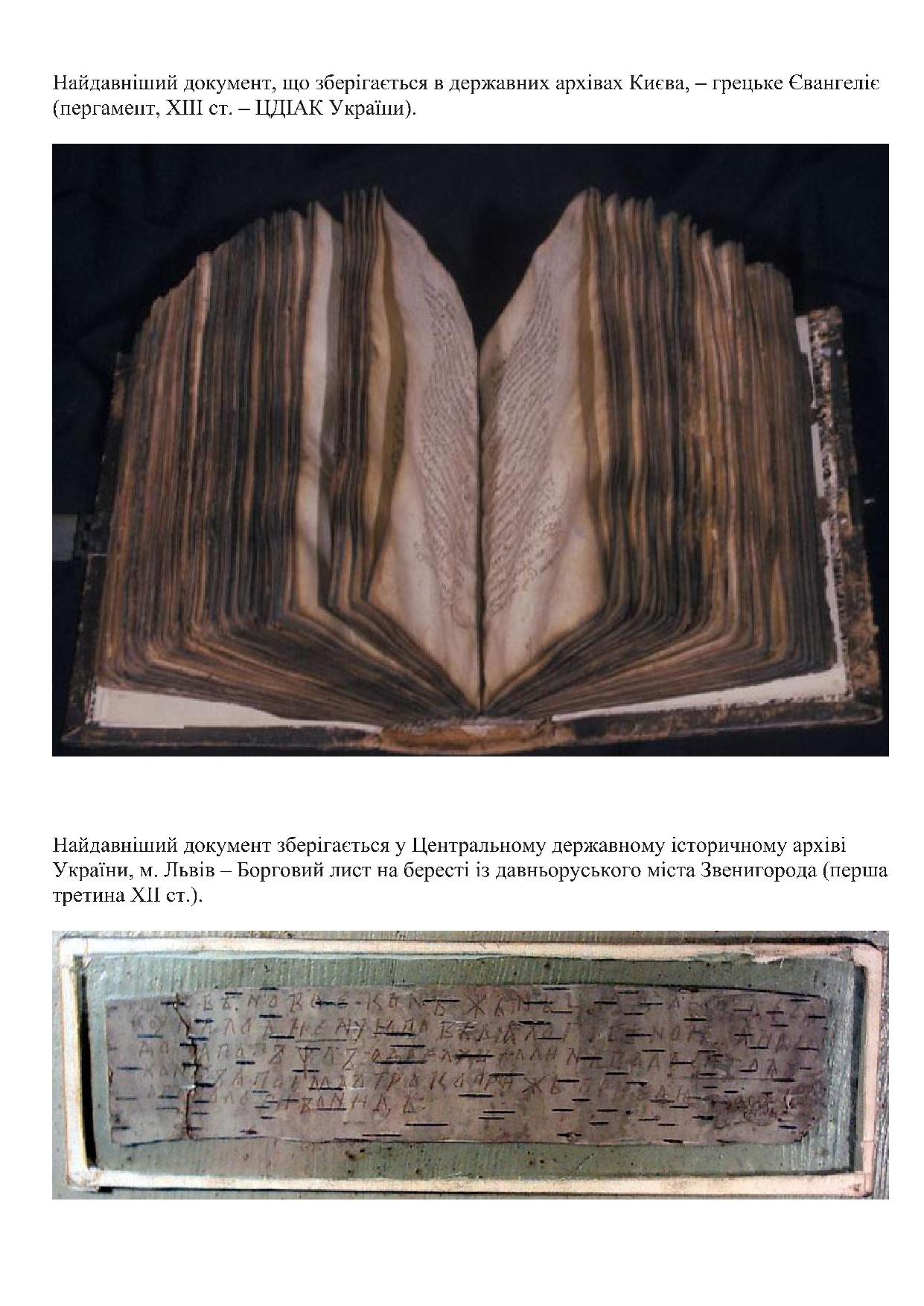 Серед представлених документів можна побачити грецьке Євангеліє ХІІІ століття, лист на бересті ХІІ століття, особову справу завідувача губернського архівного управління Еварницького (Яворницького) Дмитра Івановича, прохання Симона Петлюри щодо призначення його архіваріусом при Межовому відділі Київської міської управи.