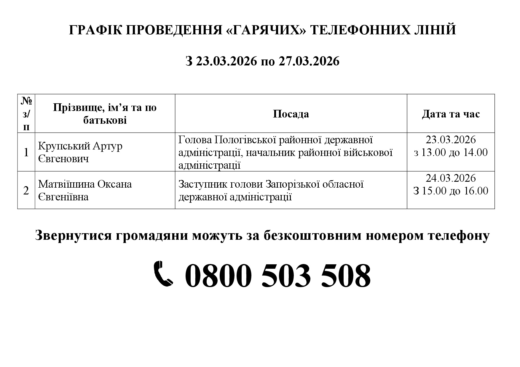 План-графік проведення прямих гарячих телефонних ліній спілкування з населенням керівництва громад Пологівського району на І півріччя 2026 року