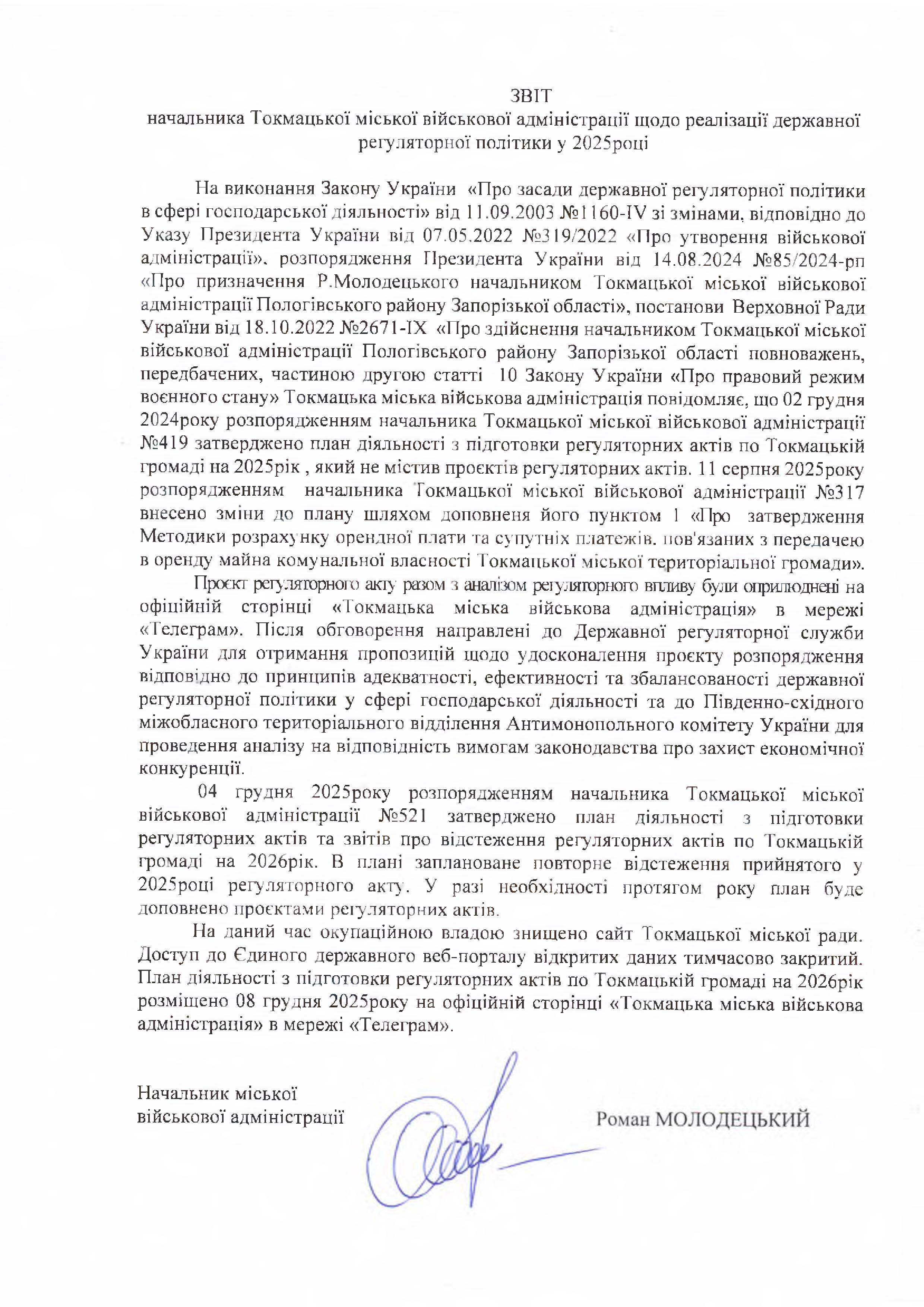 звтт начальника Токмацької міської військової адміністрації щодо реалізації державної регуляторної політики у 2025році < Попередня Наступна >